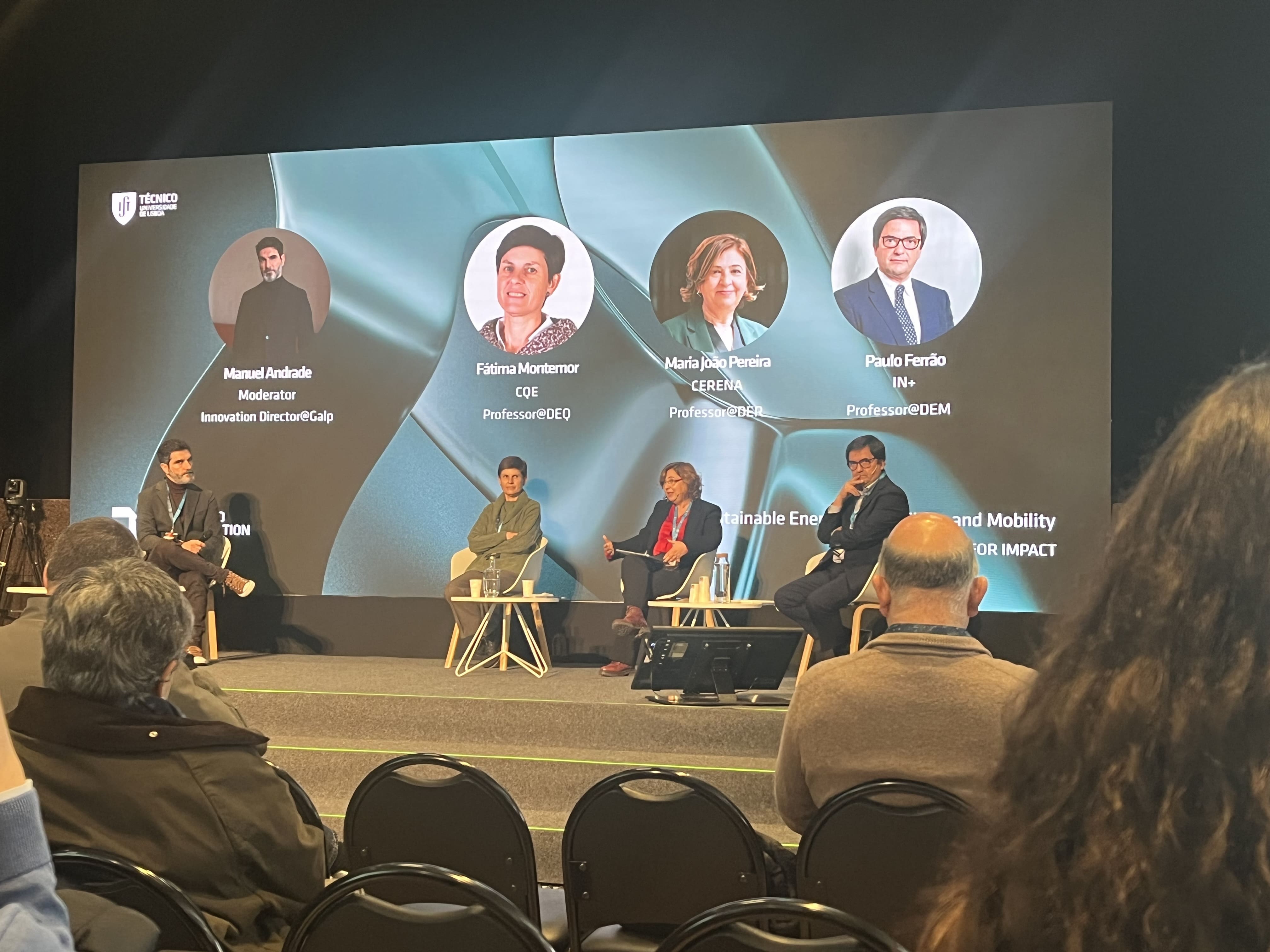 Later in the morning, Maria João Pereira took part in the fourth roundtable, alongside Fátima Montemor (CQE) and Paulo Ferrão (IN+), to debate Sustainable Energy, Smart Cities, and Mobility. It was highlighted the necessity to search for more sustainable materials, to circumvent our current environmental footprint.
